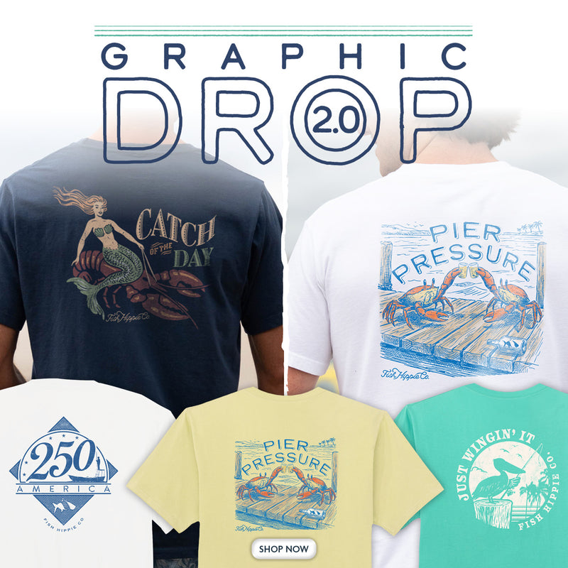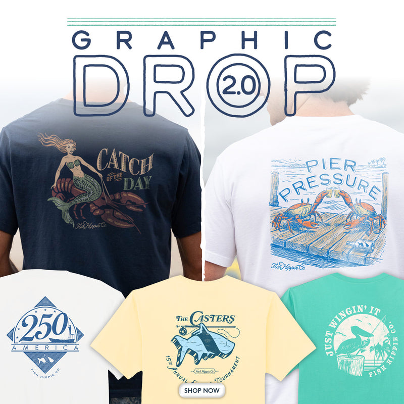 Pulled from the vault and inspired by life on the water, the Fish Hippie Graphic Collection brings together timeless graphics, soft 100% cotton comfort, and stories rooted in real moments. From the return of the Original Tarpon to the new Wetlands Navigator and Banks Camo inspired by our local Outer Banks, these collections are made for everyday wear and all the good days ahead.
